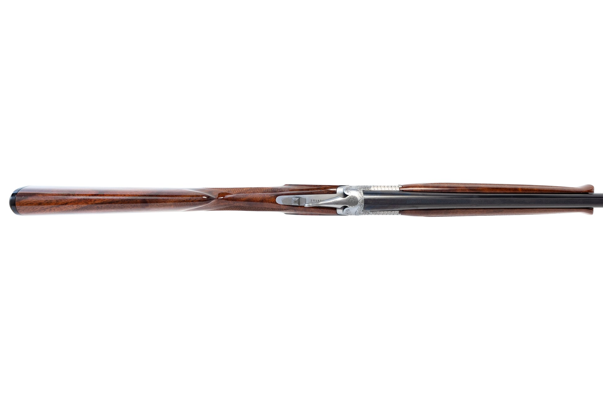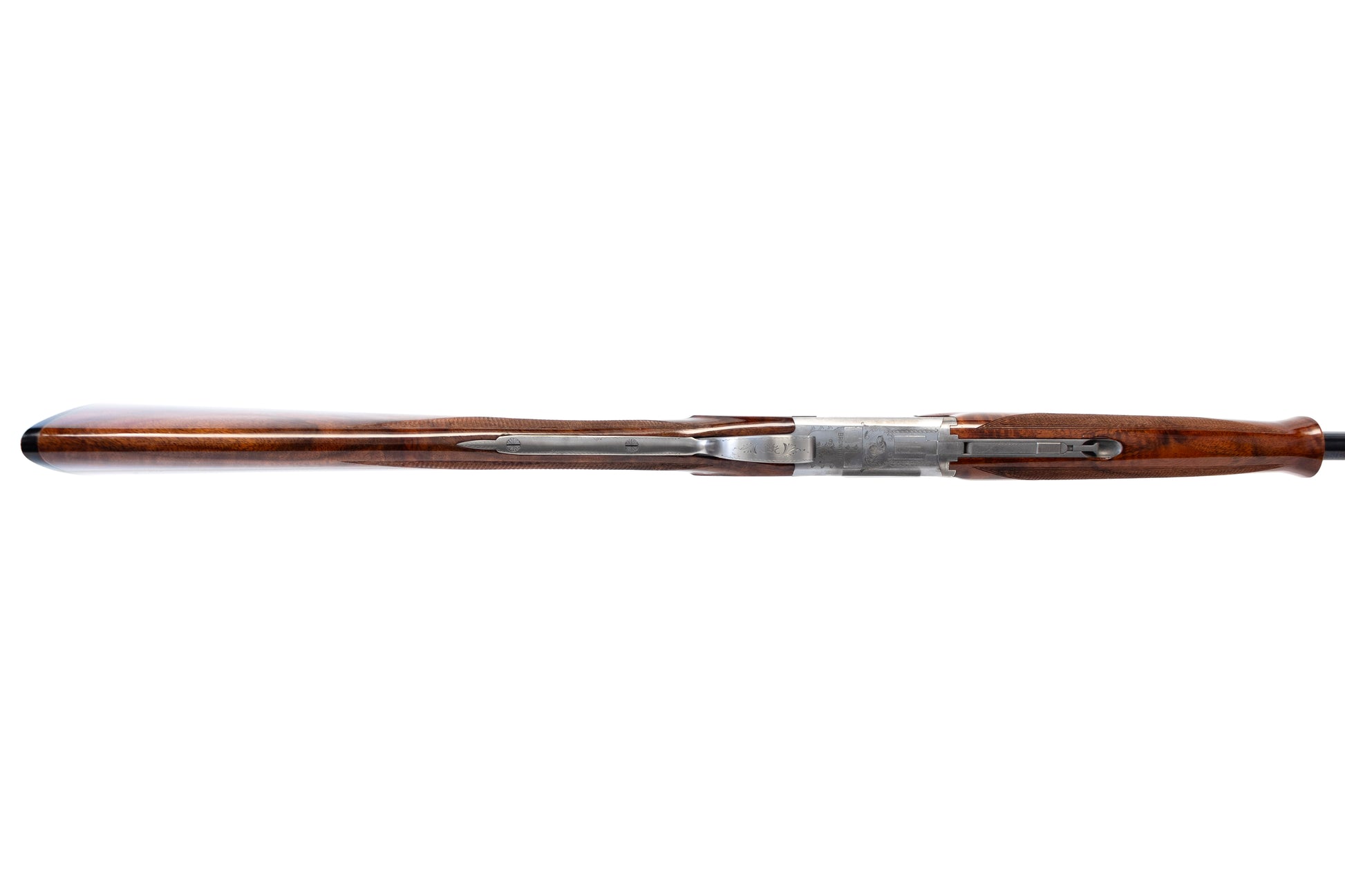 A unique fixed choke (M/IC) B125. This rarely seen inside the United States Browning features a distinguished B Grade straight stock with an extremely slight right handed cast, which is elegantly complemented by a traditional style long tang and solid butt plate. The schnabel forend is fitted with the traditional Superposed style latch system. All of the wood is in great condition for its age, with very few handling marks to the lustrous high gloss finish.